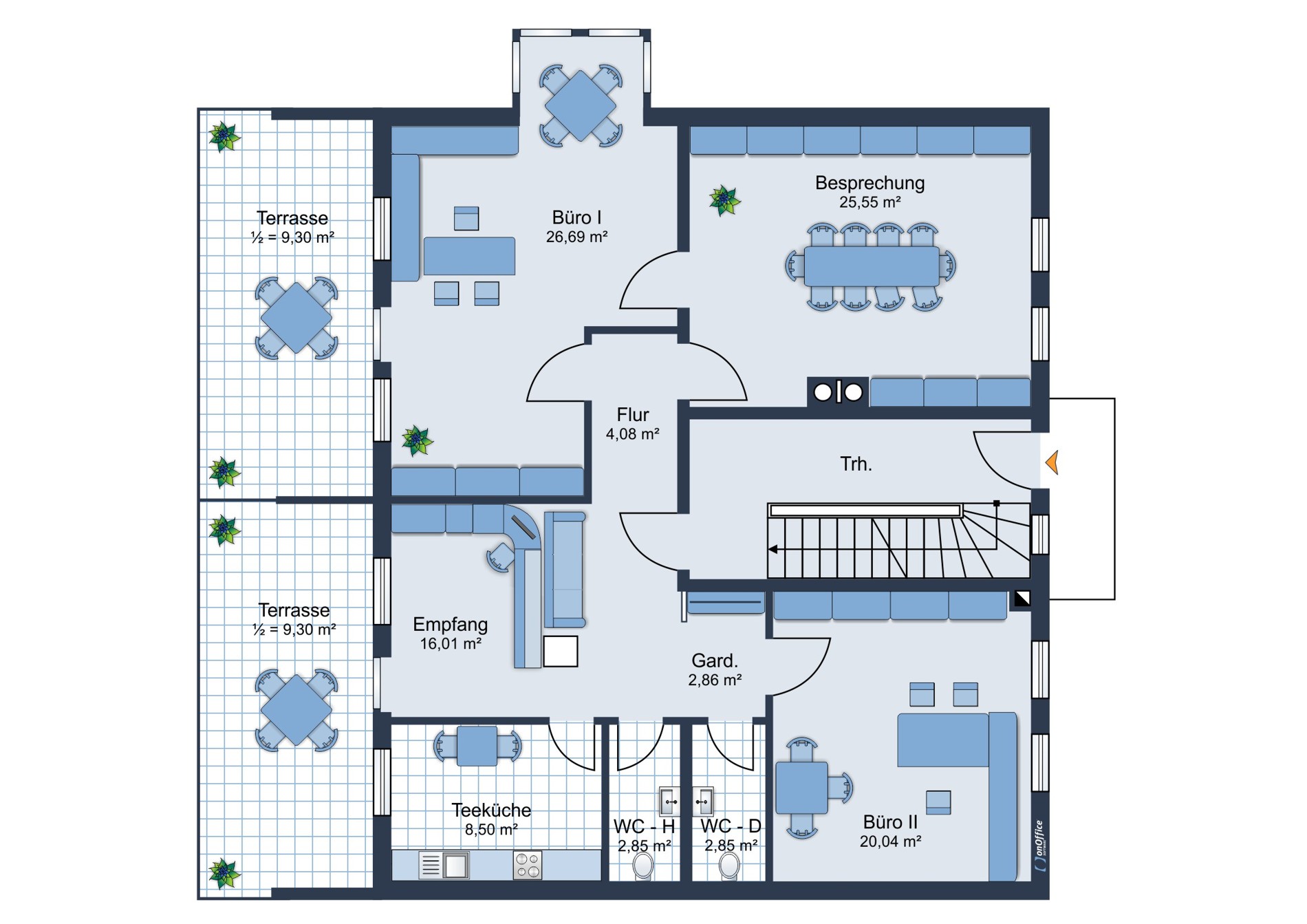 Gepflegte Bürofläche im Erdgeschoss mit Terrasse und Garten.